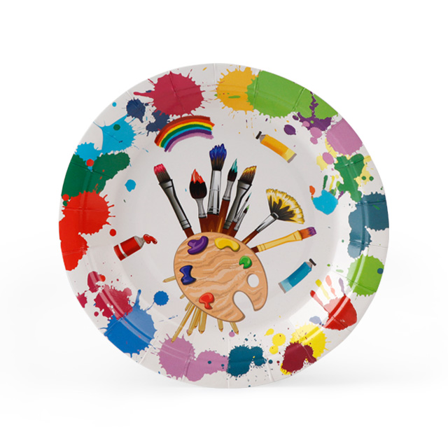 Modèles artistiques: motifs de style crayon aquarelle imprimés sur des assiettes en papier, généralement dans des couleurs vives et dans une variété de motifs artistiques.